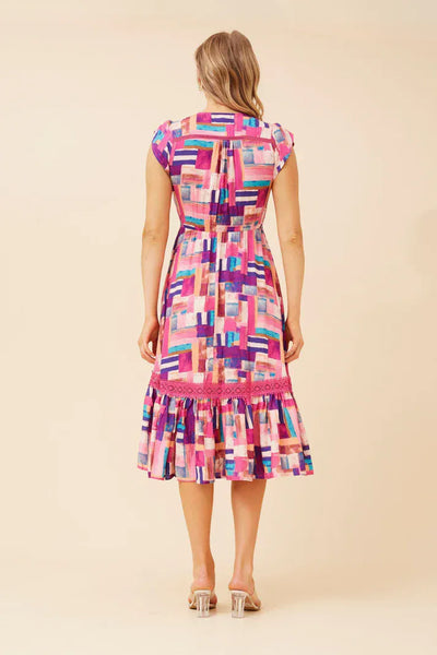 A vibrant and flattering midi dress featuring a bold abstract print in striking pink, purple and blue tones. Designed with a soft V-neckline and button-front detail, this easy-to-wear style gently cinches at the waist to create a feminine silhouette.