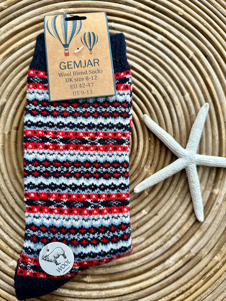 Made with a blend of wool, these soft blue socks have a Scandi pattern in blue, red and white.