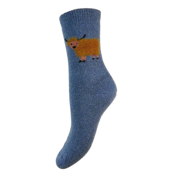 Gemjar Formally Joya, Women's Thick wool blend blue socks with fluffy Highland Cows
