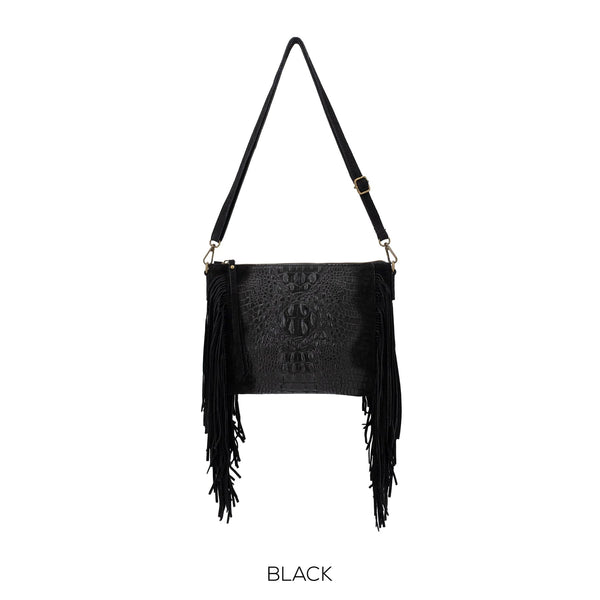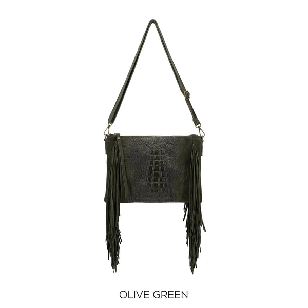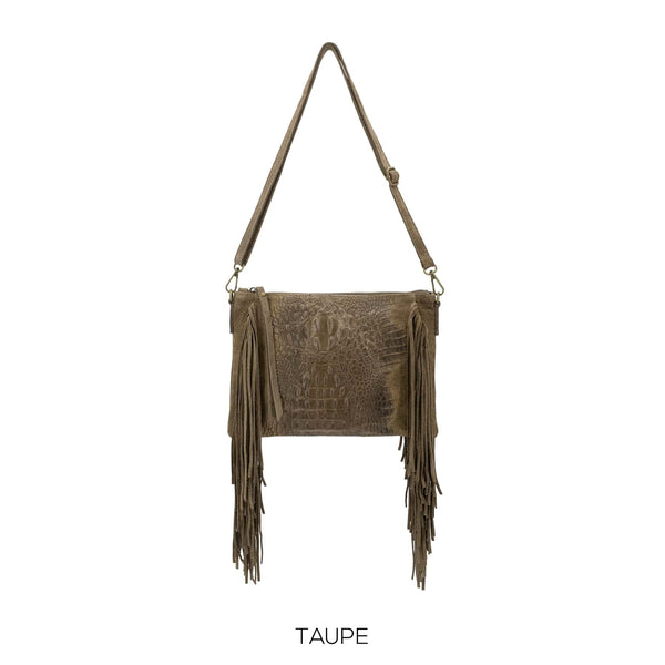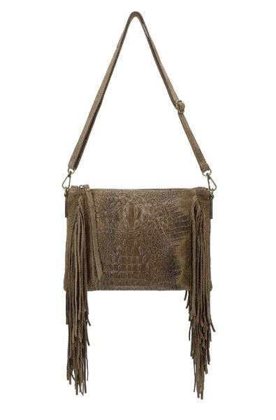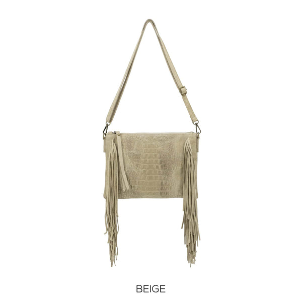 Genuine suede leather shoulder crossbody bag with tassel fringing .