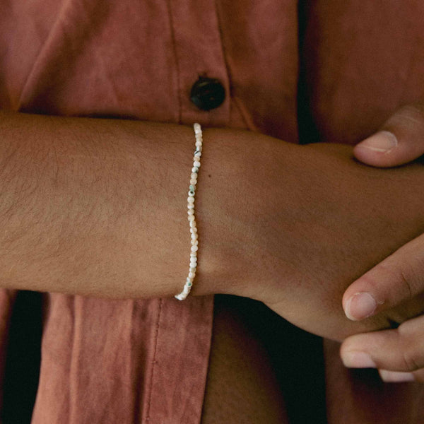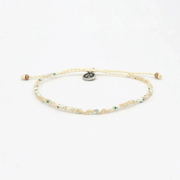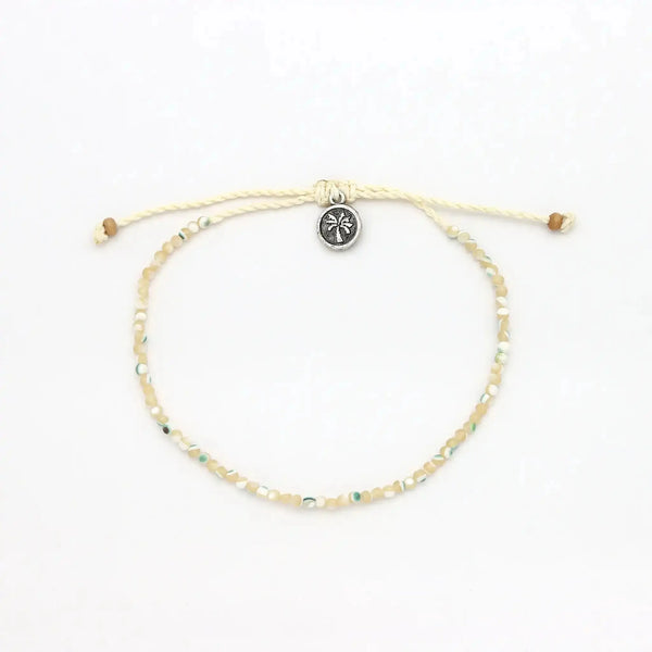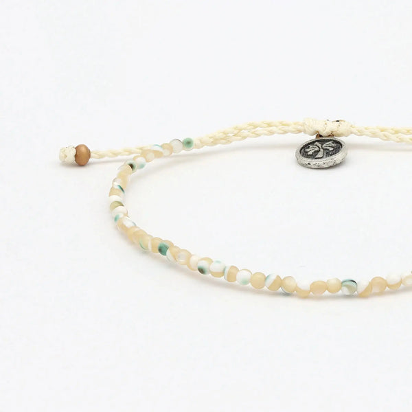 The Kualoa Beaded Shell Bracelet is made with round troca shell beads on a wax polyester cord. A simple shell bracelet with natural texture.