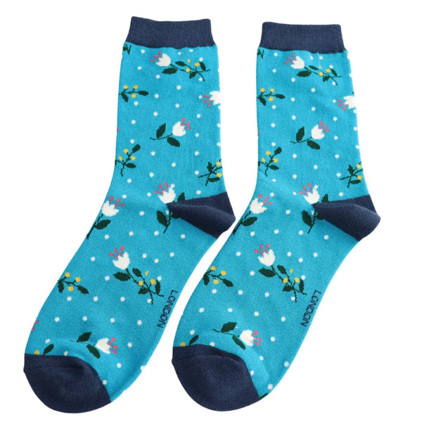 Ladies Miss Sparrow Bamboo Socks Buds & Berries Design Bright Blue