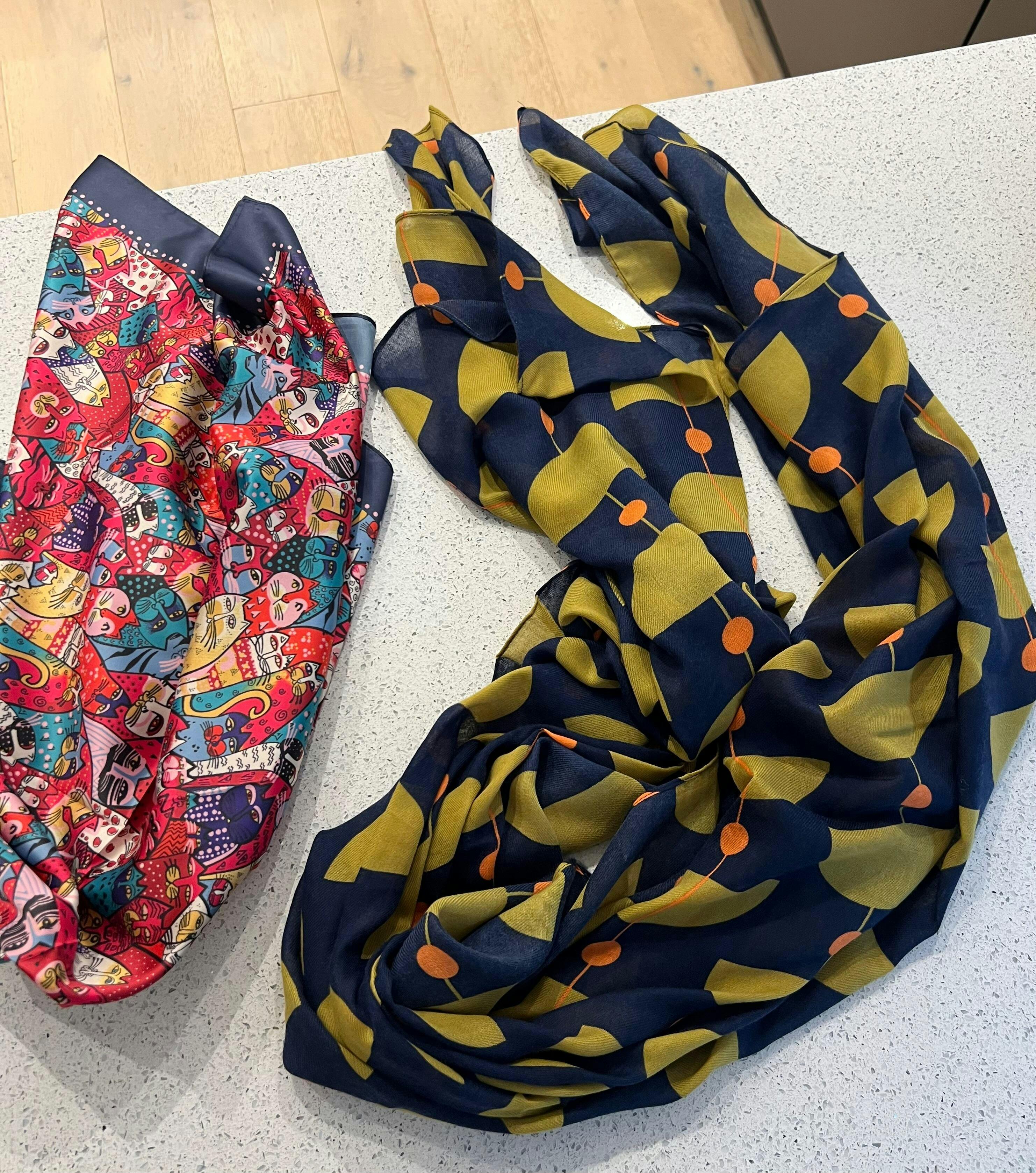 I also bought a navy blue & olive green scarf which is a medium thickness, long, great quality, & very soft. Perfect to team with my light grey-off-white raincoat!