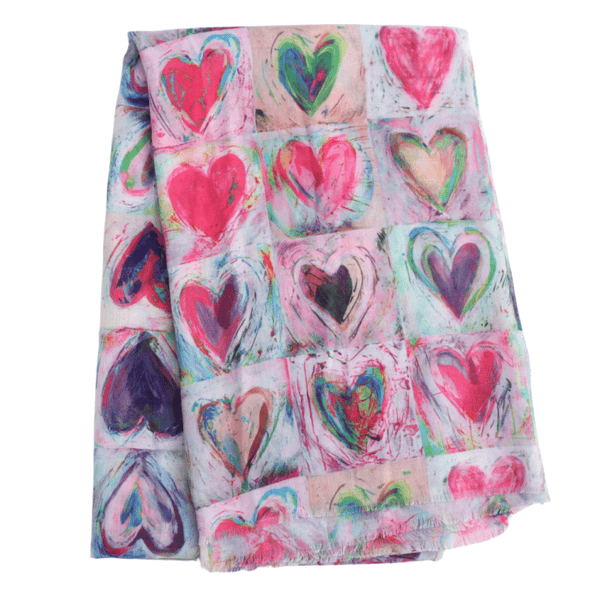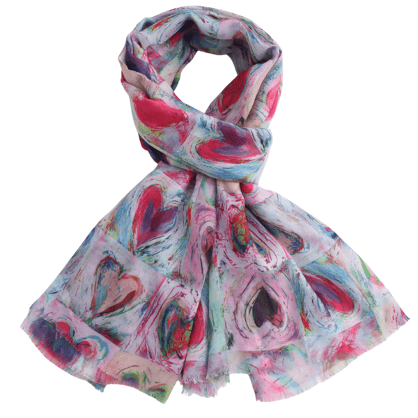 Add a pop of colour and artistry to your outfit with this stunning abstract heart print scarf. Featuring painterly heart motifs in vibrant pinks, blues and soft pastel tones, this lightweight scarf has a beautifully fluid drape that’s perfect for year-round styling.