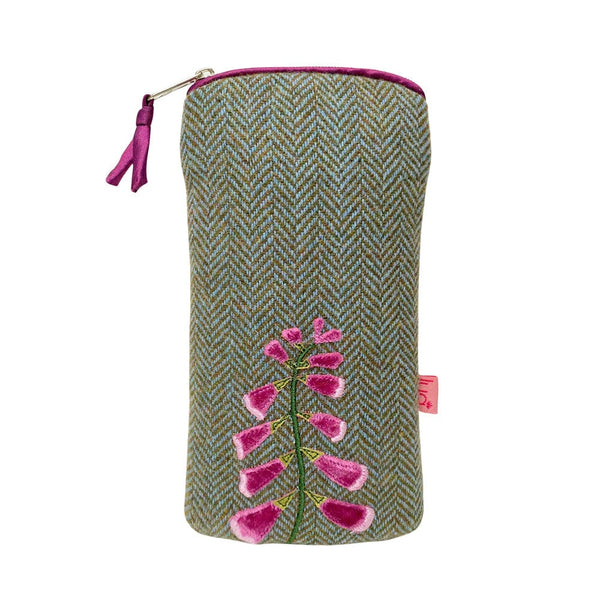 A softly padded glasses purse/pouch in a natural green fern herringbone tweed with an embroidered/appliqued Pink foxglove.