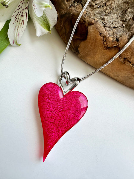 In striking fuchsia pink marbled resin, this lovely heart pendant has a second silver heart to hang from. The full pendant measures approx. 2.8cm wide by 5.5cm high. The necklace measures 41cm or 16″ long and fastens with a lobster clasp and 8cm extension chain.