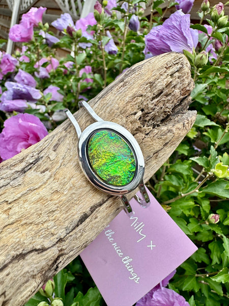 This Iridescent Green bangle is our most popular style of bracelet and uses a resin backed with marbled paper to give it texture. It has a hinged clasp making it a universal fit. The oval decoration measures approx. 3cm by 2.5cm.