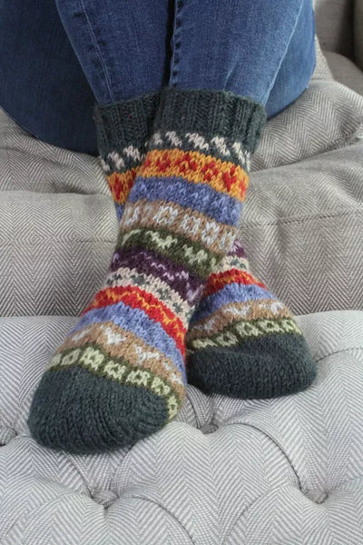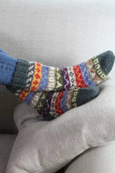 Women's hand knitted wool fairisle patterned lounge socks, with earthy fair isle colours. Fair trade and handmade in Nepal.