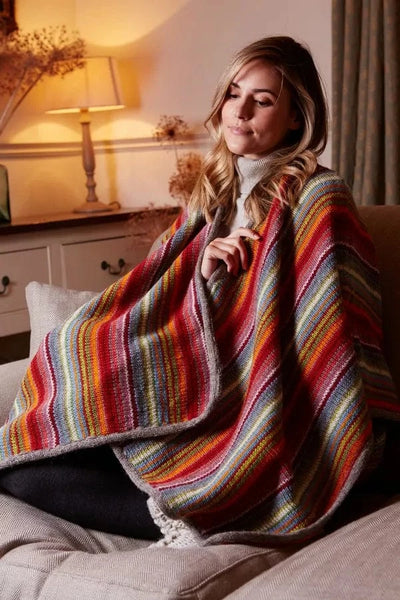 Inspired by the bright colours of Andalucia, Seville stripes will bring a smile. This wrap is ideal for adding an extra layer. It's warm, light weight and fastened with a beautiful wooden brooch.