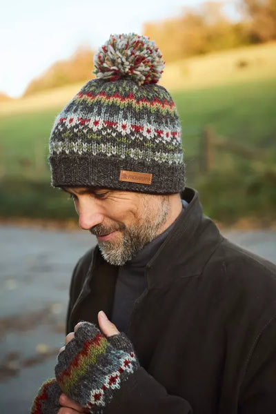 A traditional fair isle pattern on an earthy brown base, this 100% wool bobble beanie has a warm fleece lining around the forehead and ribbed roll back.