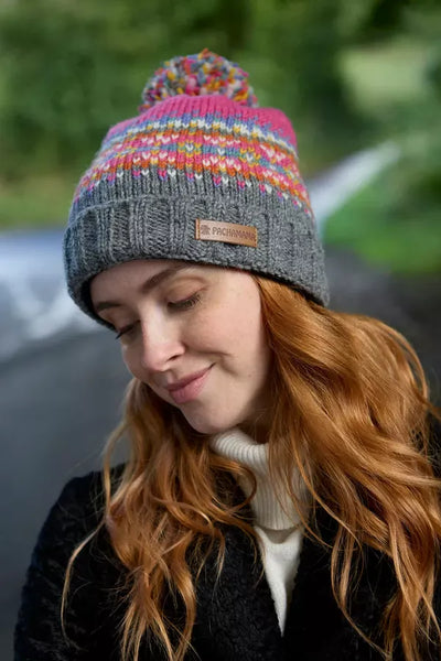 Pachamama Iona Bobble Beanie. Fleece Lined around the forehead. Made by hand. Fair Trade and Handmade in Nepal.