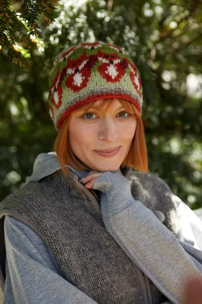 Womens hand knitted wool bobble hat, with red fox pattern, fair trade and handmade in Nepal.