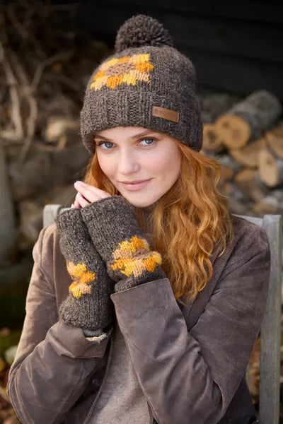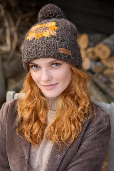 Pachamama Sunflower Bobble Beanie Bark - Retro Sunflower Motif. Revival of a vintage pattern. Fleece lined around the forehead. Fair Trade and Handmade in Nepal.