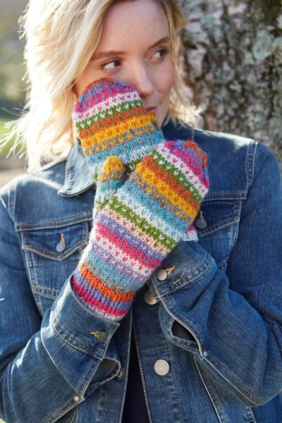 Pachamama women's warm wool mittens, ladies hand knitted mitts, winter hand covering, pink stripey pattern, fair trade and handmade in Nepal.