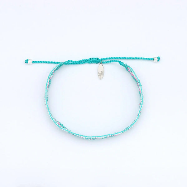 - Made with colourful glass seed beads, hand threaded and woven onto a soft nylon cord, finished with our palm tree surfboard charm.