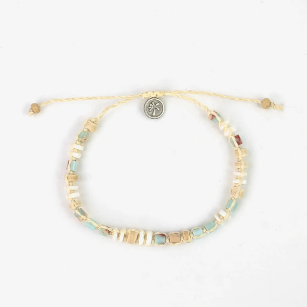The Mount Rinjani Surfer Bracelet is made with natural shell beads, stone beads and glass, finished with wood beads on a wax polyester cord. A textured beaded bracelet with an adjustable fit.