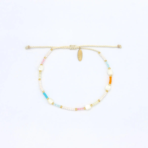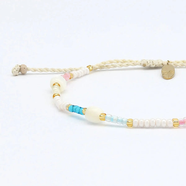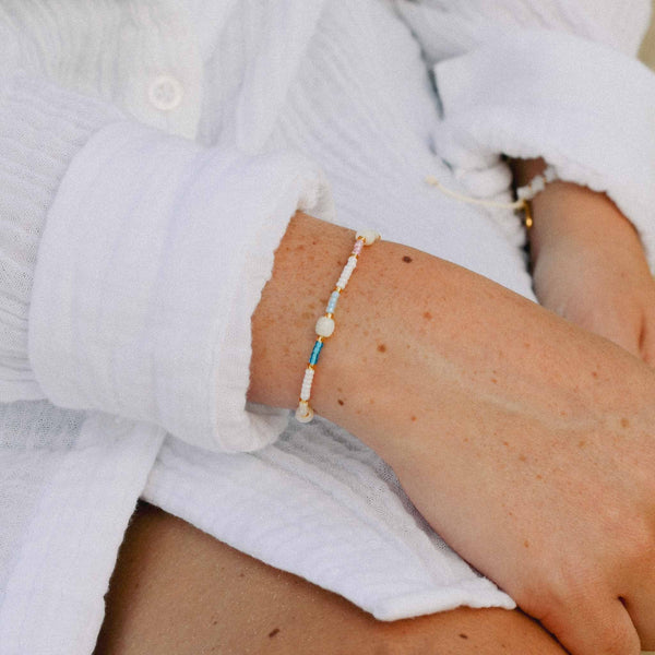 The Horison Beaded Shell Bracelet is made with colourful glass seed beads and shimmering troca shell beads on an elasticated cord. A bracelet with soft tones of beige, light orange, pink and blue.