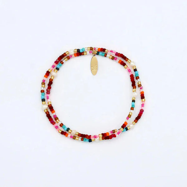 The Merah Beaded Shell Bracelet is made with glass seed beads and shimmering troca shell beads on an elasticated cord. A double-layer bracelet with warm tones of maroon and pink.