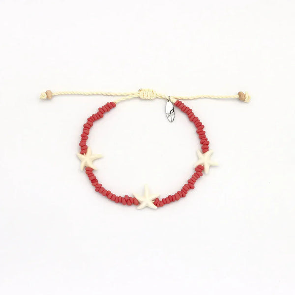 The Tidepool Starfish Bracelet is a shell beaded starfish bracelet made with irregular shell beads and small glass starfish charms on a wax polyester cord.