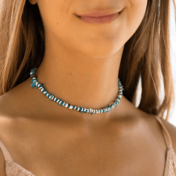 Capture the essence of coastal bliss with the Pineapple Island Troca Shell Necklace, a stunning piece handcrafted in Bali. This adjustable necklace boasts a captivating array of blue shell chip beads, delicately strung together on a durable wax polyester cord. Measuring around 36cm with a 24cm sliding knot extension, it offers a customizable fit, effortlessly enhancing any neckline with its tranquil hues and natural elegance.