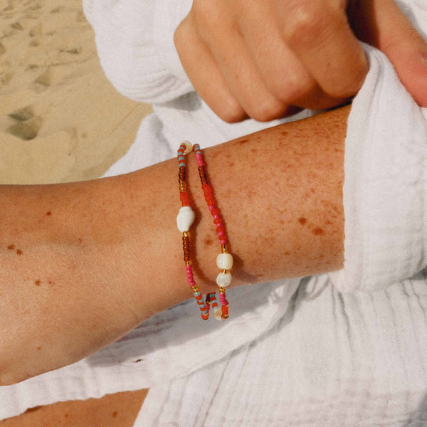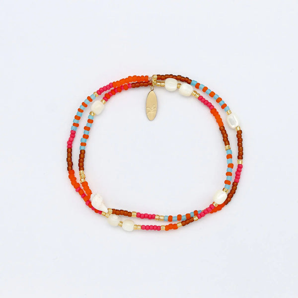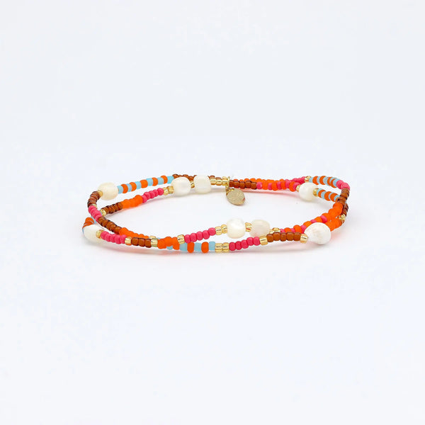 The Tropis Beaded Shell Bracelet is made with colourful glass seed beads, shimmering troca shell beads and a small natural seashell on an elasticated cord. A double-layer bracelet with tones of pink, orange, aqua blue and warm brown.