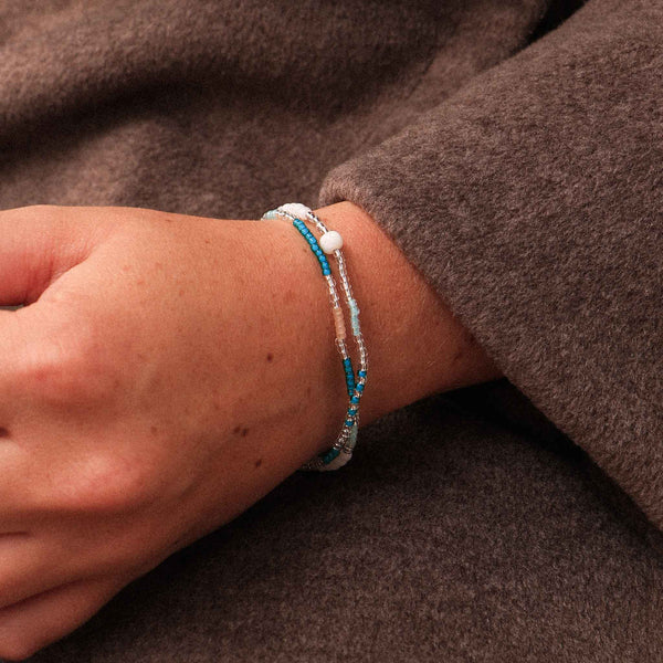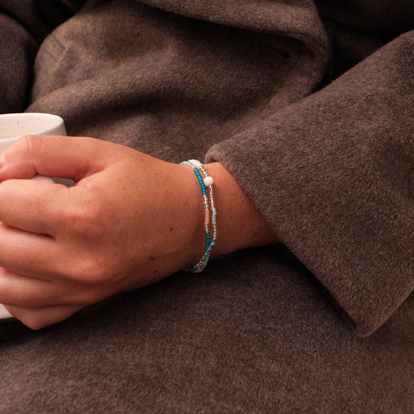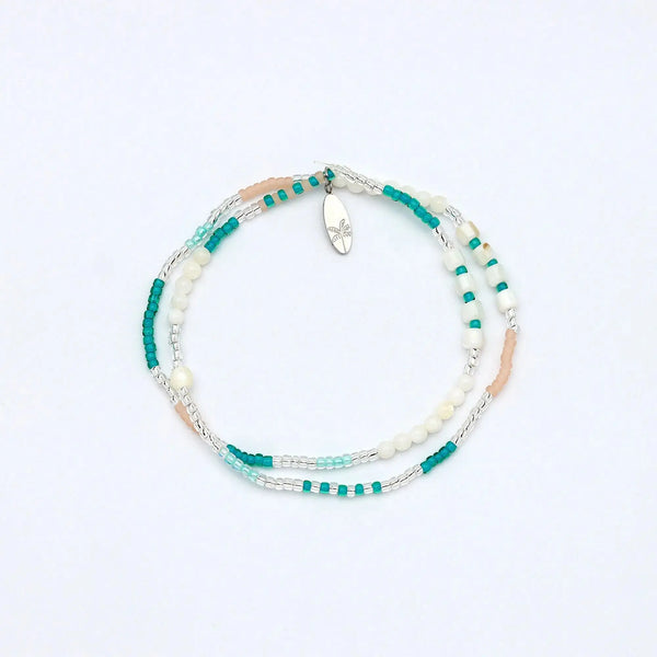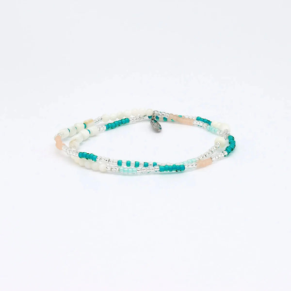 The Zermatt Blue Beaded Bracelet is made with glass seed beads and troca shell beads on an elasticated cord, finished with a stainless steel charm. A stretch bracelet with turquoise, white, blush and silver tones.